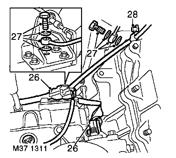 32. Remove 3 bolts securing oil cooling pipe housing to gearbox, release housing and discard 'O' rings.