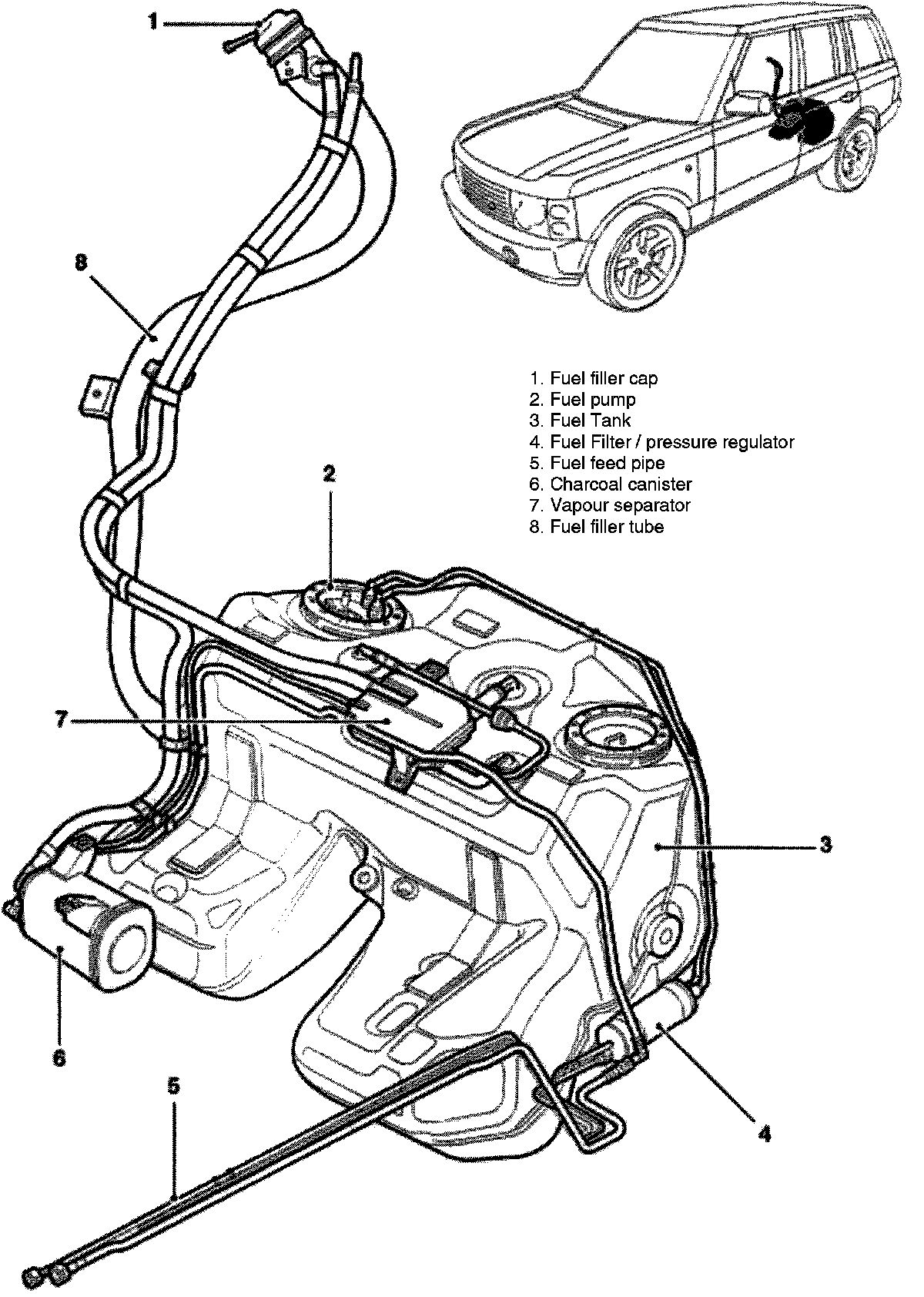 The fuel filter/pressure regulator is mounted on the lower right hand side of the tank on the right hand side. The component us covered by a plastic tray to protect them when driving off-road. The undertray has an inspection cover to enable access to the charcoal canister and the fuel filter.
