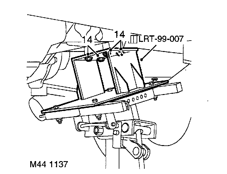 15. Fit LRT-99-007, to transmission jack and secure to transmission mounting bracket location holes with bolts.