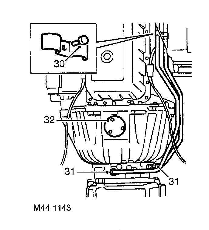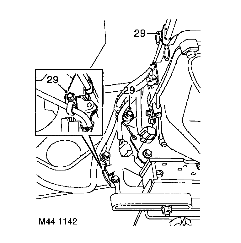 31. Remove bolt from clamp securing gearbox fluid cooler pipes to engine.
