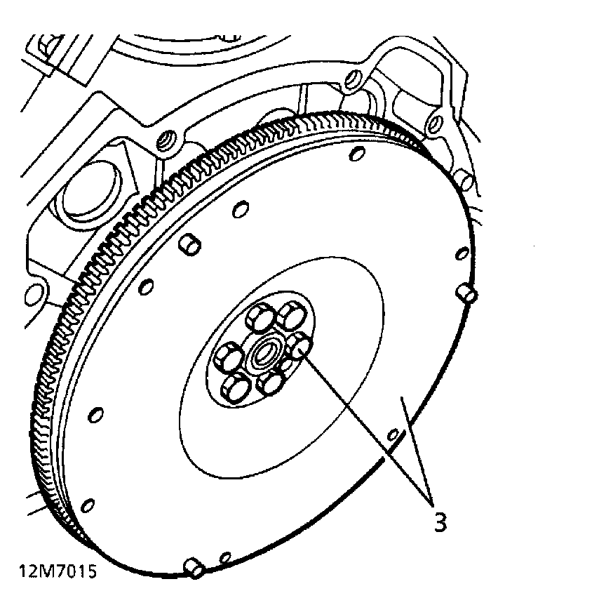 3. Remove 6 flywheel securing bolts. Remove flywheel.