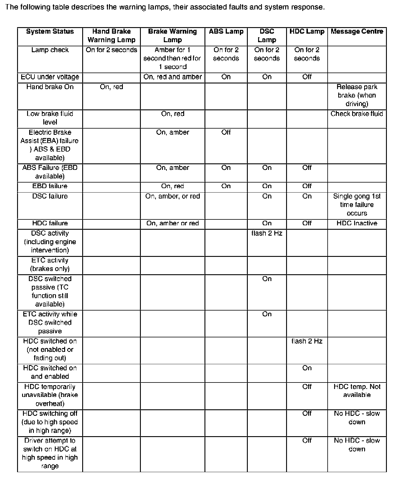The following table describes the warning lamps, their associated faults and system response.