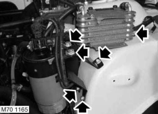 6. Td6 models: Remove nut and 3 bolts securing fuel filter/cooler bracket assembly and move aside.