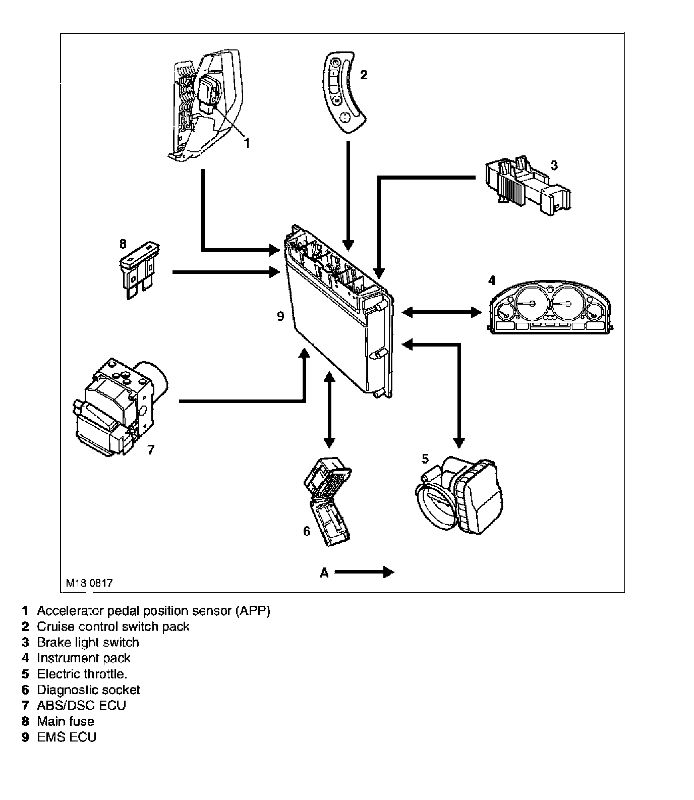 Cruise control functionality is fully integrated into the ME 7.2 ECU and uses electric throttle intervention to automatically maintain a set vehicle speed. Once engaged, the system can also be used to accelerate the vehicle without using the accelerator pedal. the cruise control system Consists of: