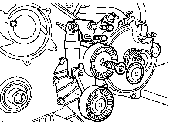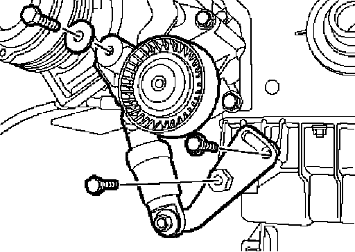3. Remove 2 bolts securing ancillary drive belt tensioner to lower timing gear cover.
