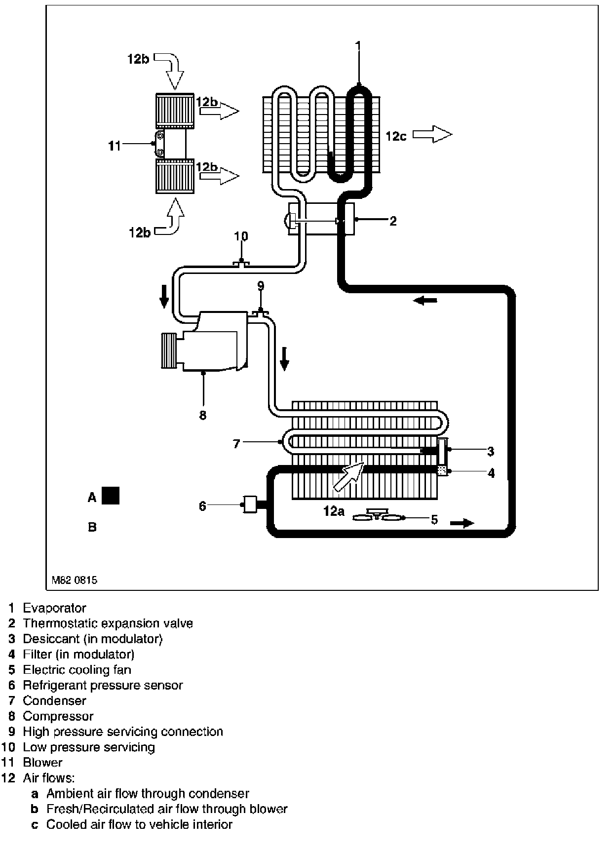 The evaporator is installed in the heater assembly between the blower and the heater matrix, to absorb heat from the exterior or recirculated air. Low pressure low temperature refrigerant changes from liquid to vapour in the evaporator, absorbing large quantities of heat as it changes state.