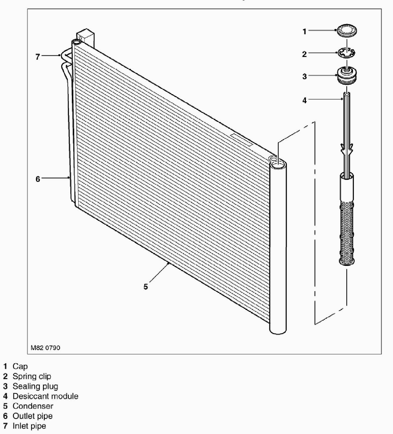 The condenser transfers heat from the refrigerant to the surrounding air to convert the vapour from the compressor into a liquid. A receiver drier module integrated onto the LH side of the condenser, incorporates a filter and a desiccant to remove solid impurities and moisture from the refrigerant.