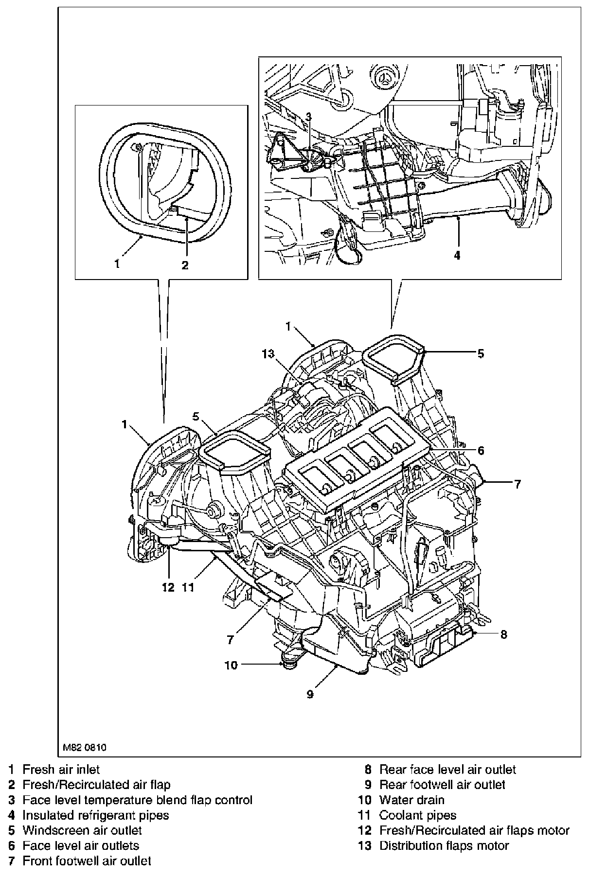 The heater assembly controls the temperature, volume and distribution of air supplied to the distribution ducts as directed by selections made on the ATC ECU control panel. The assembly is installed on the vehicle centre-line between the fascia and the engine bulkhead. The heater assembly consists of a casing formed from a series of plastic mouldings. Internal passages integrated into the casing guide the air through the casing and separate it into two flows, one for the LH outlets and one for the RH outlets. Two drain outlets at the bottom of the casing are connected to overboard drain hoses in the sides of the transmission tunnel.