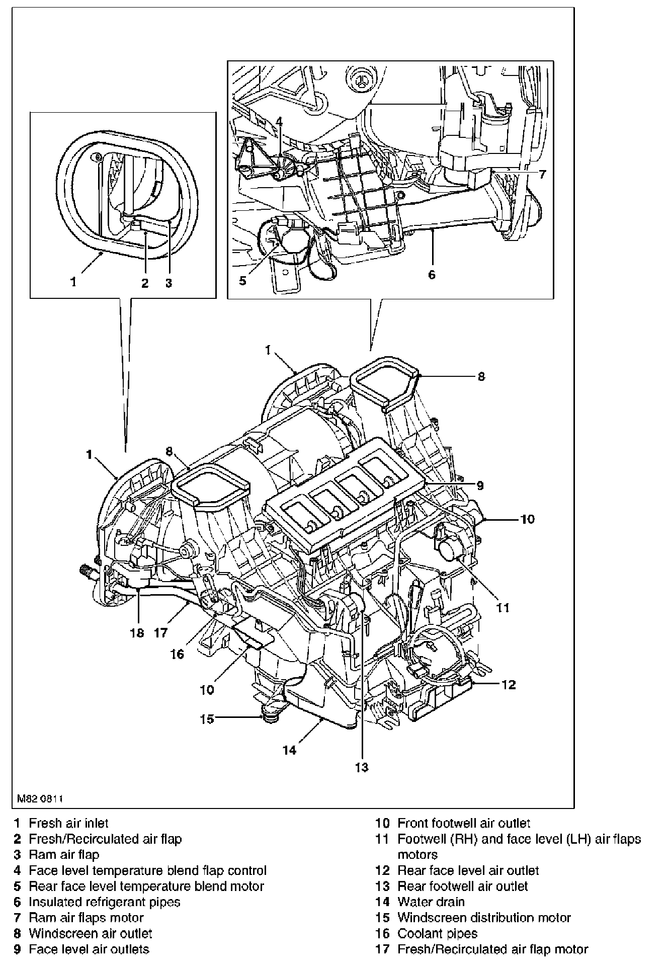 On both the low and high line heater assemblies, a fresh/recirculated air flap is installed in the air inlet on each side of the heater assembly. A stepper motor drives the LH fresh/recirculated air flap and a Bowden cable transmits the drive from the LH to the RH fresh/recirculated air flap. On the high line system, a ram air flap is installed inside each fresh/recirculated air flap. A stepper motor drives the RH ram air flap and a Bowden cable transmits the drive from the RH to the LH ram air flap.