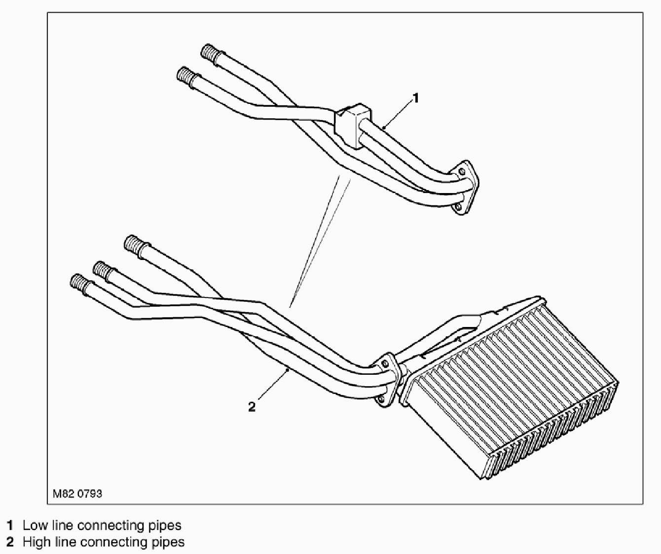 The same heater matrix is used in both the low and high line heater assemblies. The heater matrix is internally divided into two separate halves with separately coolant inlets for each half and a common coolant outlet. On the low line system, the two coolant inlets are connected to a common feed from the single coolant valve. On the high line system each coolant inlet pipe is connected to a feed from a separate coolant valve.