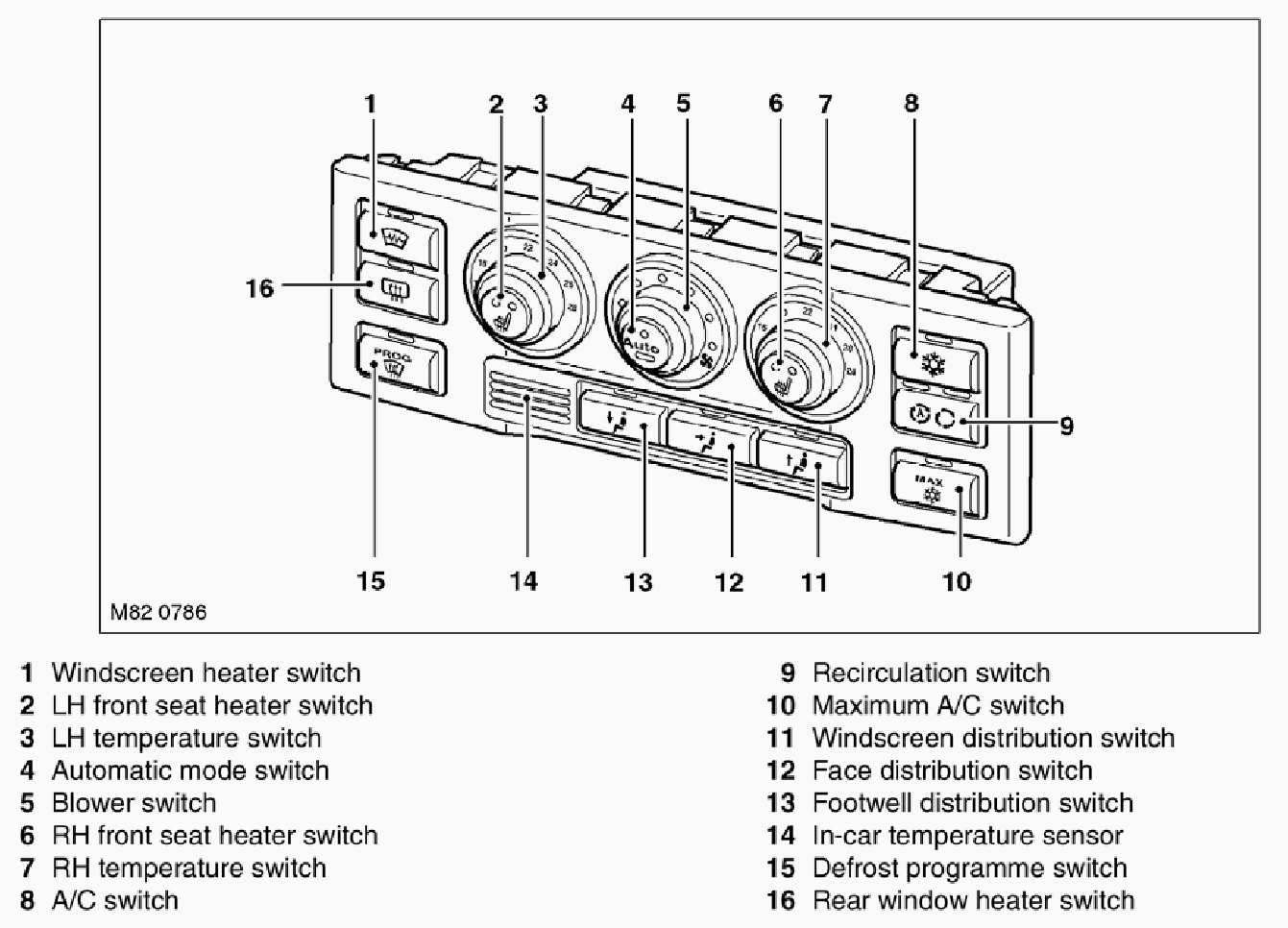 - Defrost Programme Switch: Activates a programme that automatically selects the windscreen heater on, activates the compressor and changes the system settings to direct dry heat to the windscreen. A LED above the switch is illuminated while the defrost programme is active.