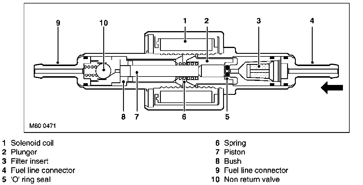 While the solenoid coil is de-energised the spring holds the piston and plunger in the 'closed' position at the inlet end of the housing. An 'O' ring seal on the plunger provides a fuel tight seal between the plunger and the filter insert, preventing any flow through the pump. When the solenoid coil is energised, the piston and plunger move towards the outlet end of the housing, until the plunger contacts the bush; fuel is then drawn in through the inlet connection and filter. The initial movement of the piston also closes transverse drillings in the bush and isolates the pumping chamber at the outlet end of the housing. Subsequent movement of the piston then forces fuel from the pumping chamber through the non return valve and into the line to the FBH unit. When the solenoid de-energises, the spring moves the piston and plunger back towards the closed position. As the piston and plunger move towards the closed position, fuel flows past the plunger and through the annular gaps and transverse holes in the bush to replenish the pumping chamber.