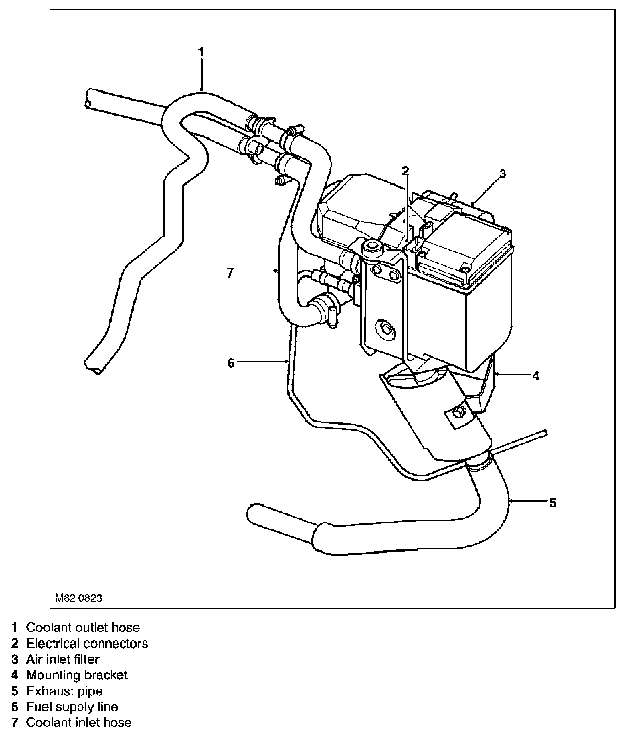 The FBH unit is installed in the passenger side rear of the engine compartment below the battery. It is connected in series with the coolant supply to the heater assembly. Two electrical connectors on the FBH unit connect it to the vehicle wiring.