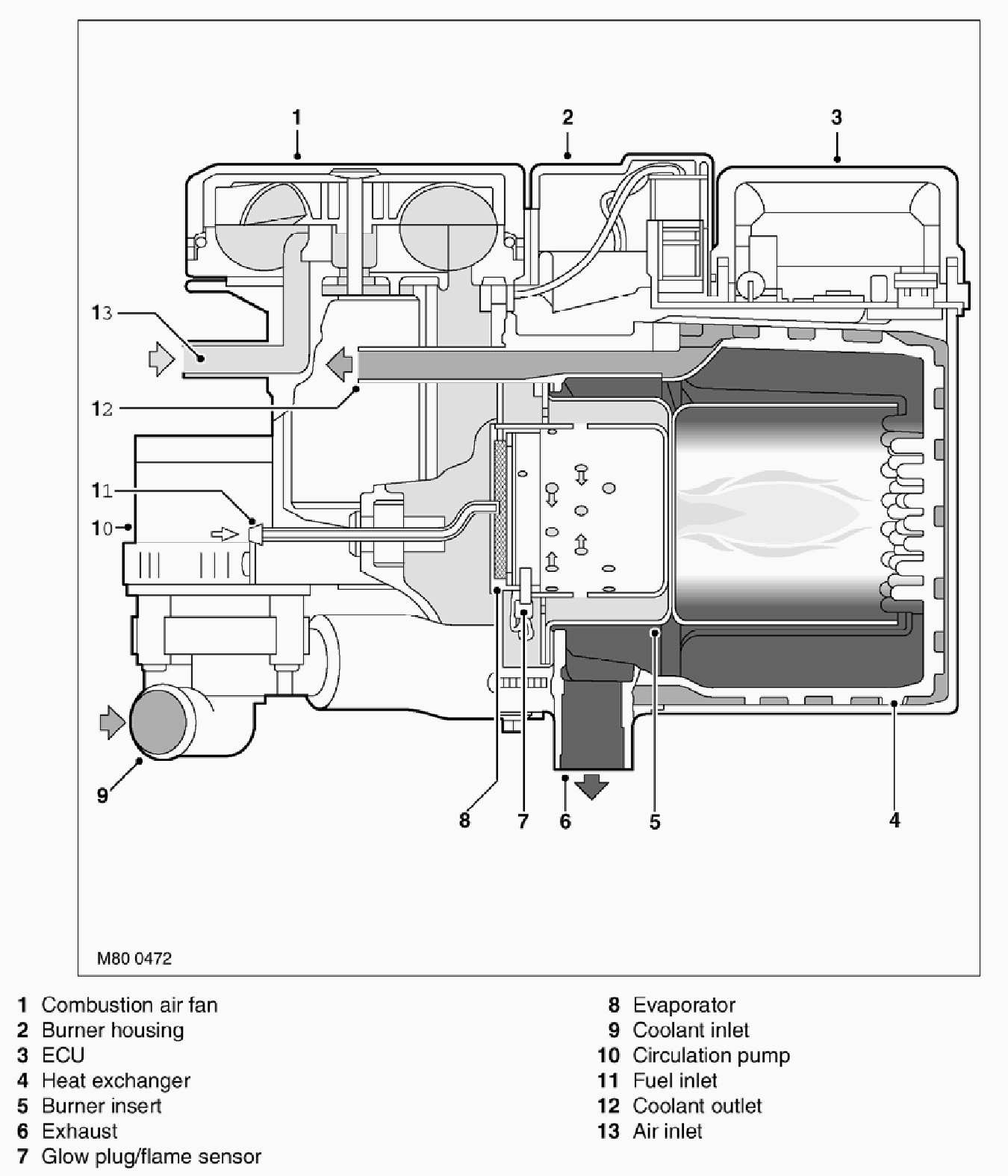 ECU/Heat Exchanger: The ECU controls and monitors operation of the FBH system. Ventilation of the ECU is provided by an internal flow of air from the combustion air fan. The heat exchanger transfers heat generated by combustion to the coolant. A sensor in the heat exchanger provides the ECU with an input of heat exchanger casing temperature, which the ECU relates to coolant temperature and uses to control system operation. The temperature settings in the ECU are calibrated to compensate for the difference between coolant temperature and the heat exchanger casing temperature detected by the sensor. Typically, as the coolant temperature increases, the coolant will be approximately 7 °C (12.6 °F) hotter than the temperature detected by the sensor: as the coolant temperature decreases, the coolant will be approximately 2 °(3.6 F) cooler than the temperature detected by the sensor.