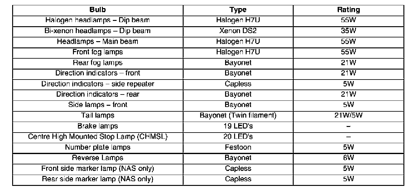 A monitoring system within the LCM can determine a bulb failure and indicate this to the driver via the instrument pack message centre. The following table shows the bulbs monitored by the LCM and their type and rating: