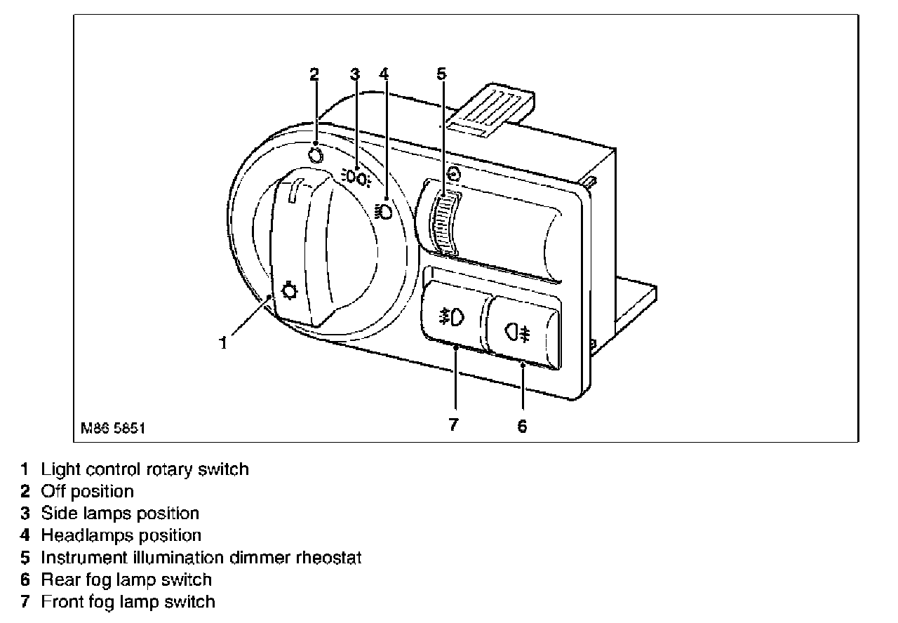 The light control switch is located in the fascia between the steering column and the driver's door. The switch comprises a three position rotary switch for controlling side lamps and headlamps, a thumbwheel rheostat which manually controls the fascia and interior switch night illumination, and momentary push switches for front and rear fog lamps.