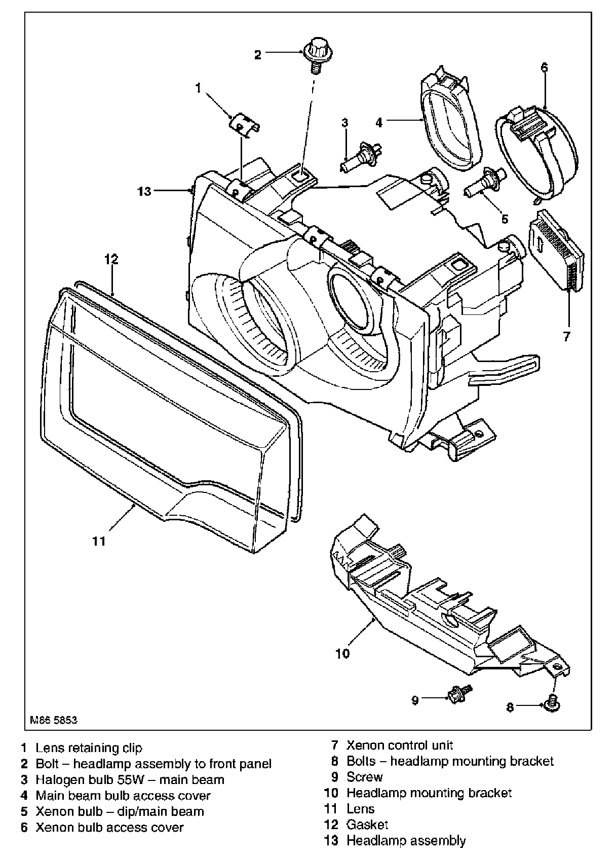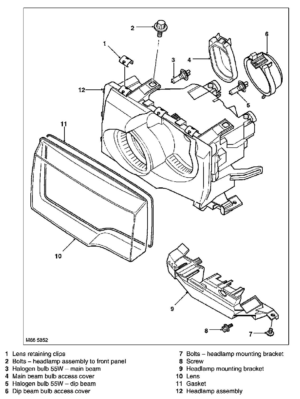 The main beam bulbs are quartz halogen with a rating of 55 W. The bulbs are retained in the headlamp unit with conventional wire retaining clips.