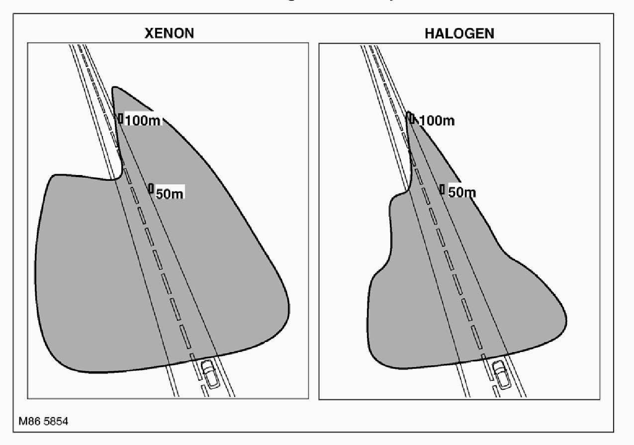 The bi-xenon dip/main beam head lamps use ellipsoidal technology for the lens and reflector providing improved night time visibility compared with conventional halogen head lamps. The bi-xenon headlamps provide the following benefits when compared to halogen headlamps: