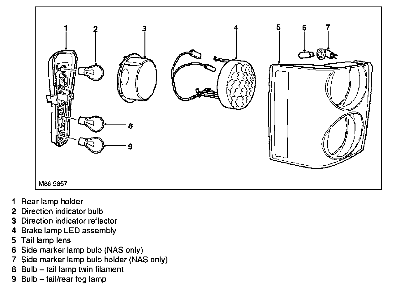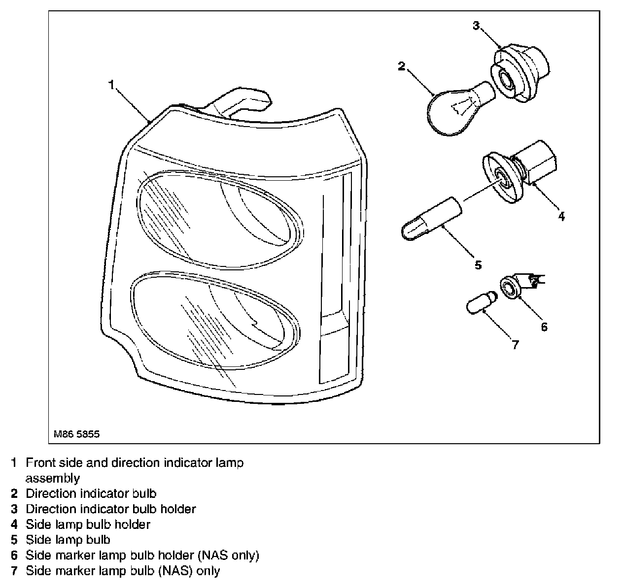 On NAS vehicles an additional lamp holder is used to accommodate the side marker lamp. The lamp assembly lens has a vertical section which is used as the side marker illumination required for the NAS market. The side marker lamp bulb is a 5 W bayonet fitting.