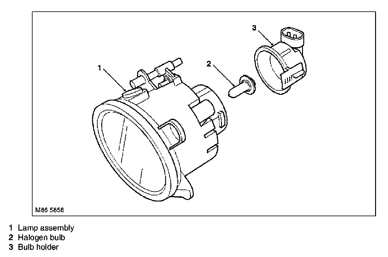 The direction indicator fog lamp and side lamp bulbs are located in a holder. The holders is secured in the lamp housing by two plastic clips. The holder has a connector to allow for connection to the electrical harness.