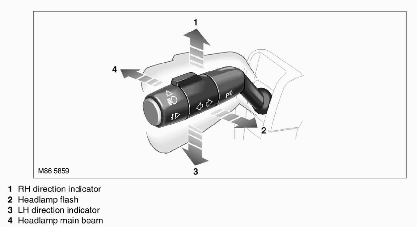 The main beam/direction indicator column control switch is located on the left hand side of the steering column and controls the following functions: