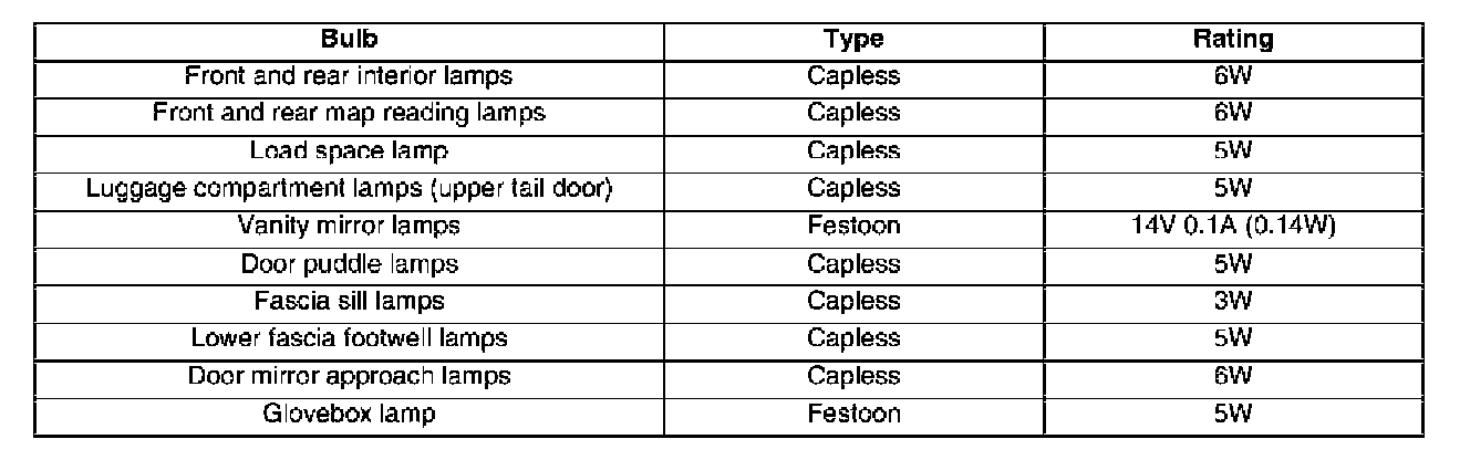 The following table shows the bulbs used for the interior lighting and their type and rating: