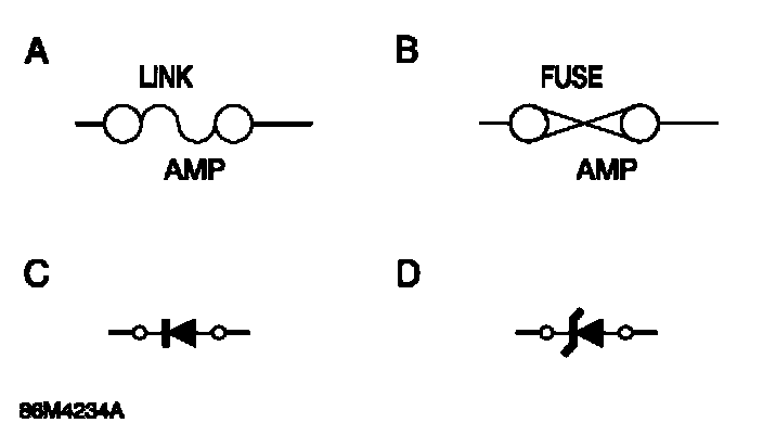Fusible links(A) and current rated fuses (B) are identified as shown.