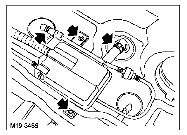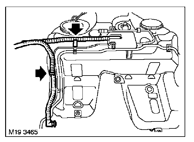 4. Release fuel tank breather hose and charcoal canister vent pipe from securing clips on fuel tank.
