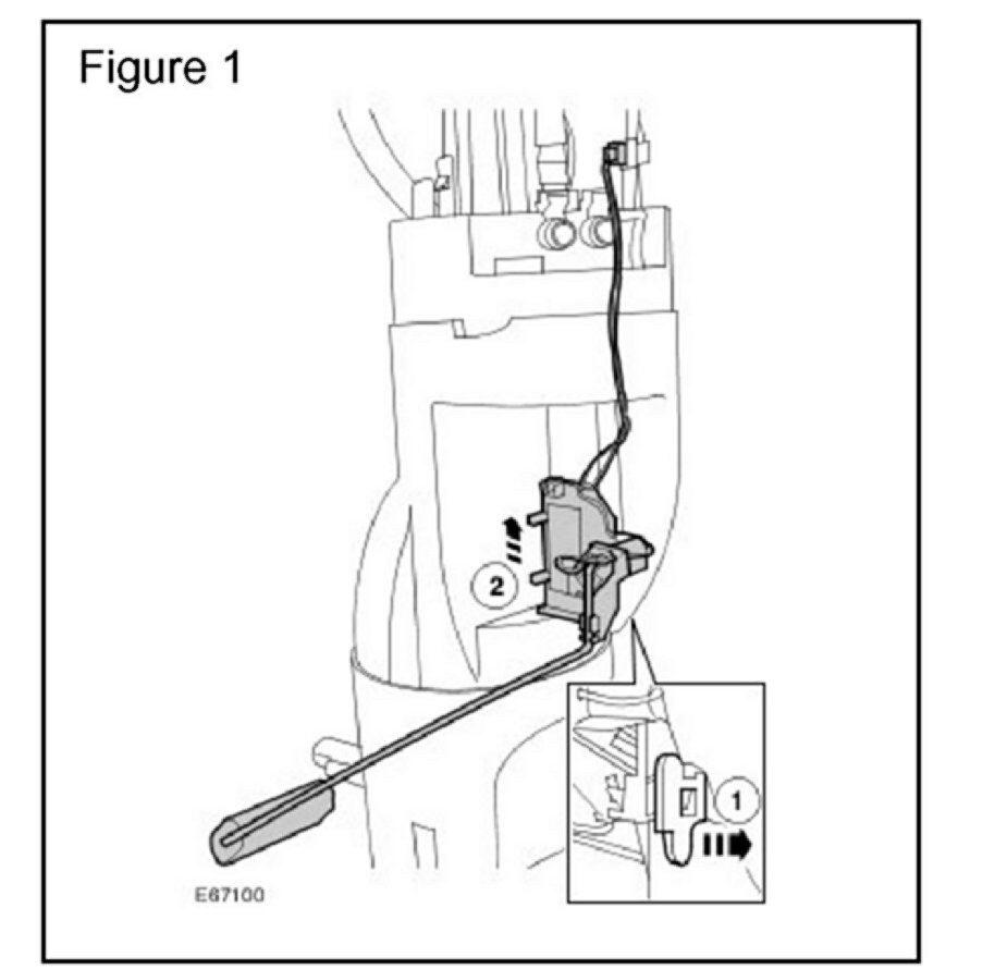 4. Release the sender unit securing tang ("1" in Figure 1) and slide the sender unit from the fuel pump body. ("2" in Figure 1)