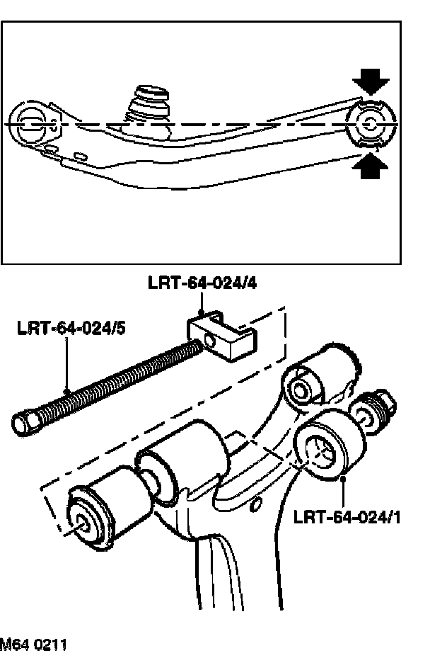 1. Align bushes as shown and fit using LRT-64-024/1 with LRT-64-024/4 and LRT-64-024/5.