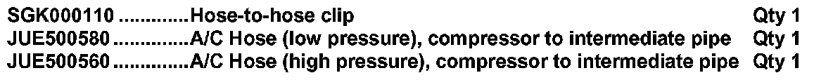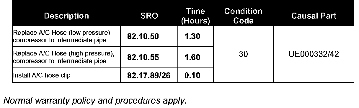 Should a customer complain of inoperative Air Conditioning, determine the cause or the source of the leak. Install a hose retaining clip between the compressor and the intermediate pipes and replace any affected A/C hoses.