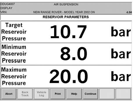23. Verify the "Target Reservoir Pressure" displays 10.7 bar and the "Minimum Reservoir Pressure" displays 8.0 bar.