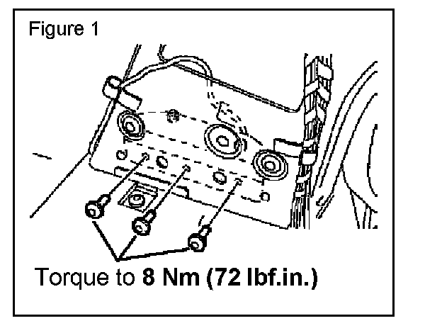 5. Tighten the side crash sensor retaining bracket Torx bolts to 8 Nm (72 lbf.in.). (Figure 1)