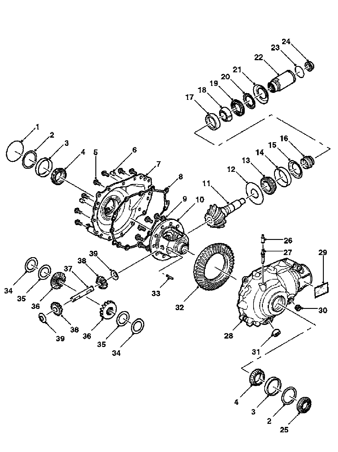 The crown wheel drive gear is located on the carrier and secured with ten screws. The carrier is mounted on taper roller bearings located in each casing half. The bearings are press fitted into the casing and a spacer is located on the outside face to apply preload to the bearing.