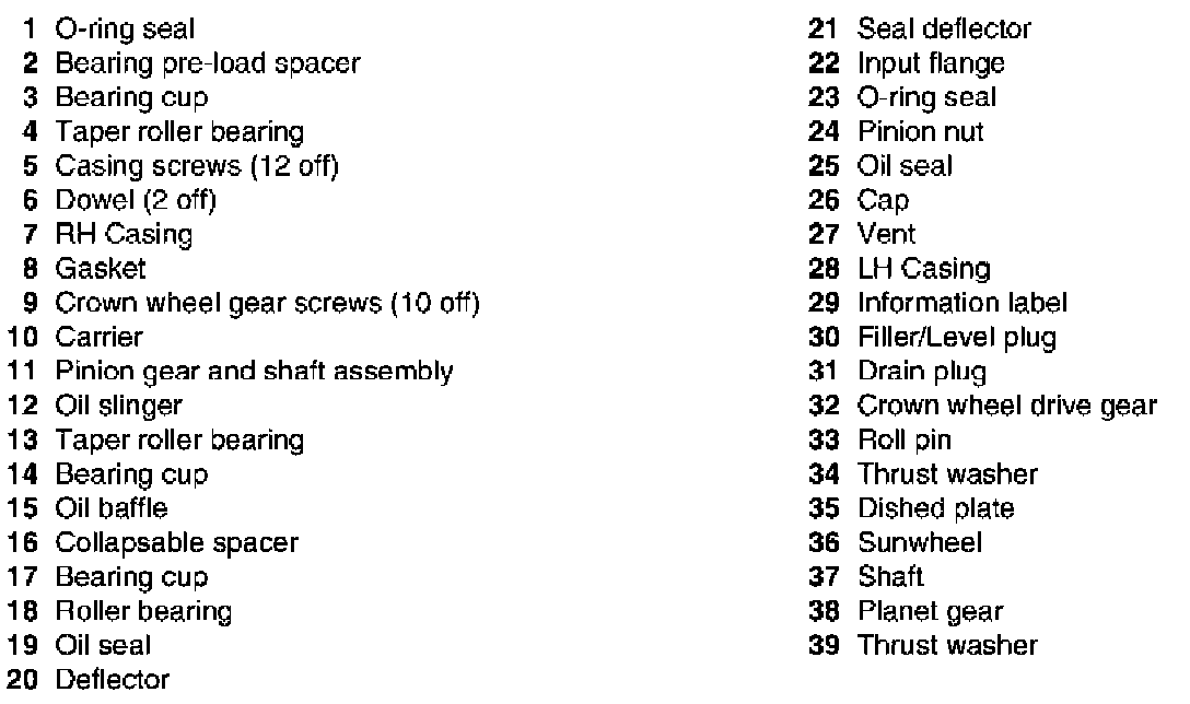 The LH casing is fitted with a drain plug and a filler/level plug. The level plug allows the unit to be filled with oil until it leaks from the filler hole, ensuring the correct quantity of oil is added. The differential unit contains approximately 0.8 litre of oil for a dry fill and requires approximately 0.75 litre if oil is changed due to residual oil retained in the casings.