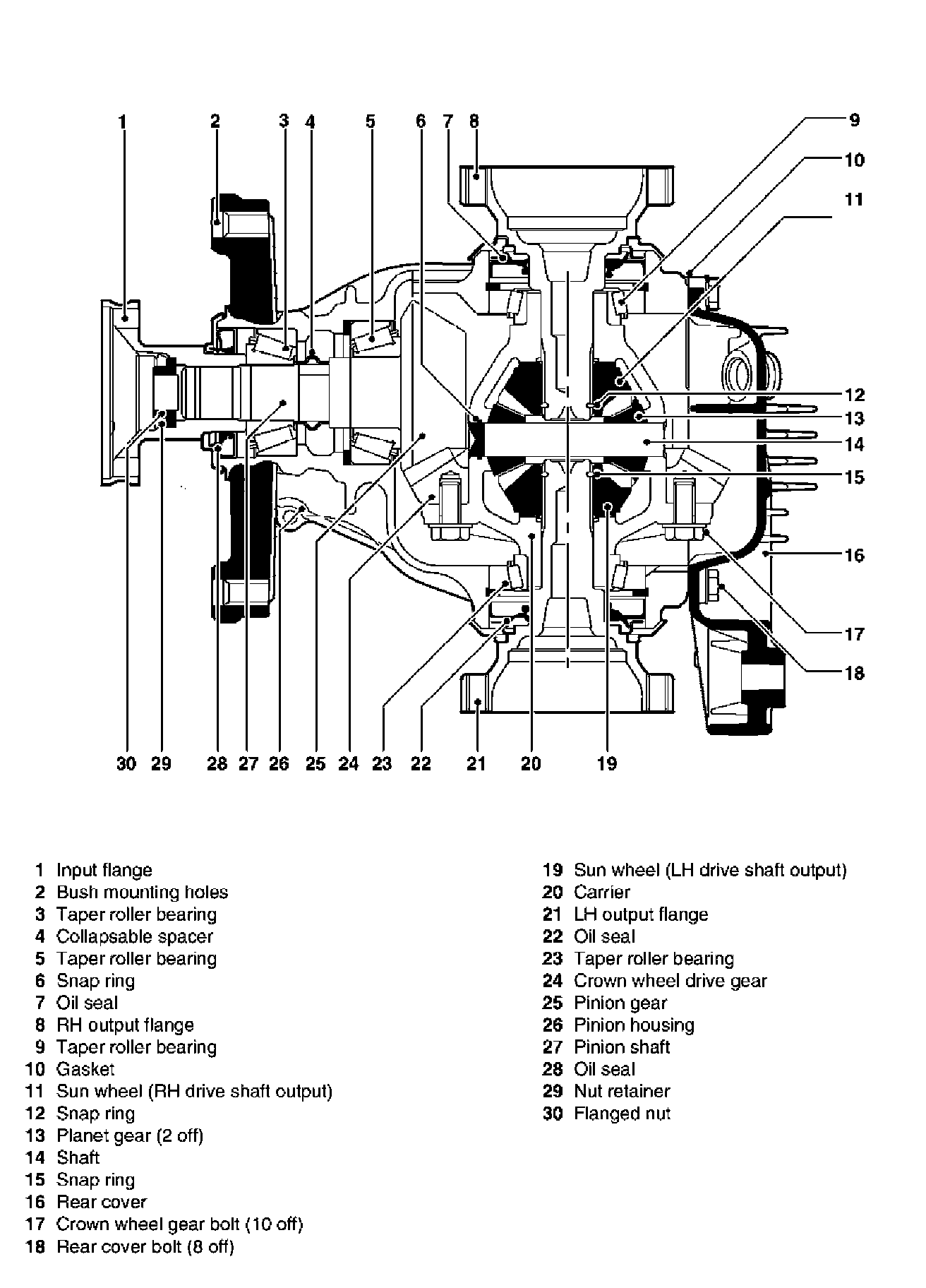 Each output flange has a splined shaft which located in each sun wheel. A snap ring fitted to the splined shaft locates in the groove the sun wheel bore and positively located the output flange. Oil seals are pressed into each side of the pinion housing and seal the output flange to the housing. Each output flange has six threaded holes which provide for the attachment of the rear drive shafts.