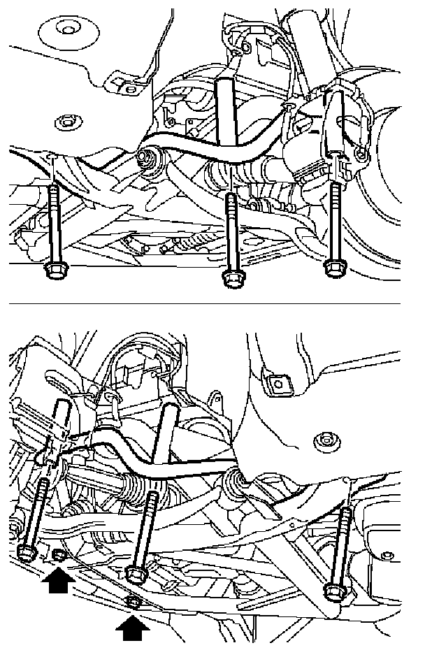 8. Tighten 2 bolts securing sub-frame to front cross member to 132.5 Nm (97 ft. lbs.).