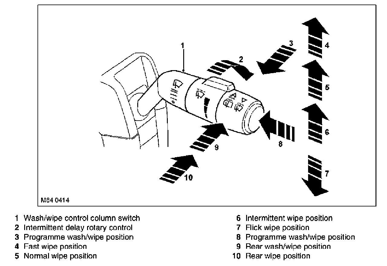 The wiper control column switch is located on the right hand side of the steering column and controls all front and rear wiper functions.
