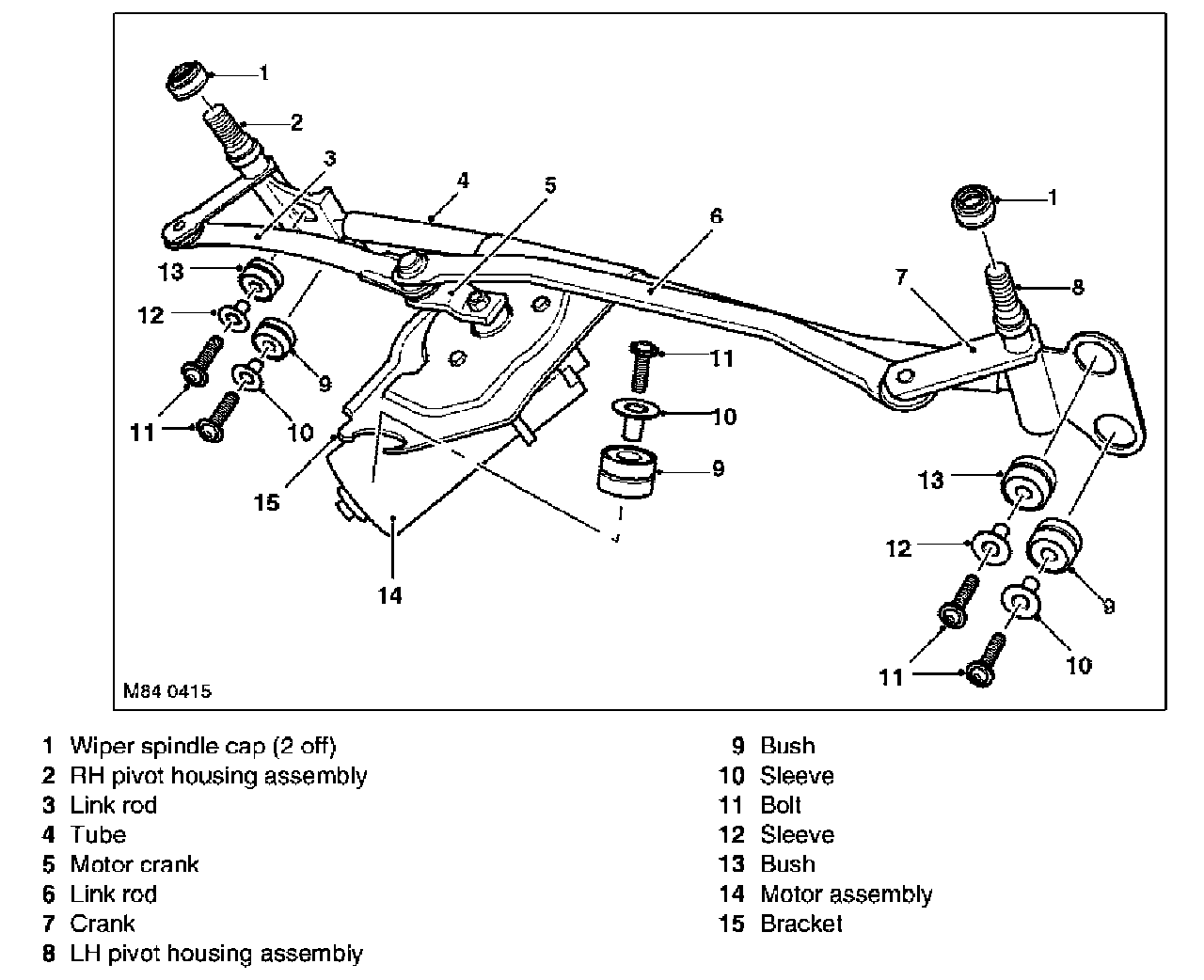 The wiper linkage and motor assembly are available as separate components. The wiper linkage differs between LH and RH drive models. The wiper motor is common to LH and RH drive models.