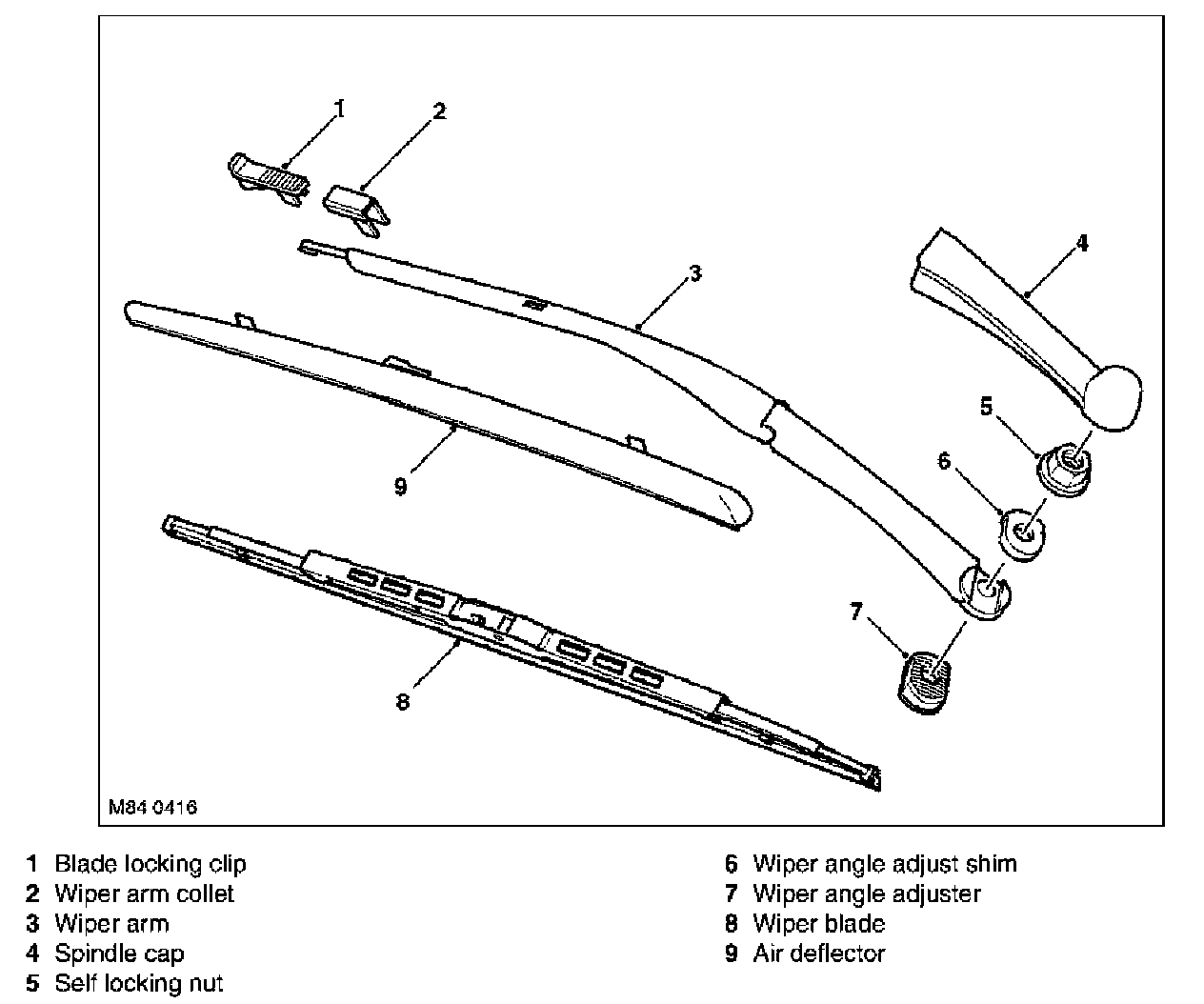 The wiper arms are positively located on tapered splines on the wiper linkage spindles. The arm is located on a curved wiper angle adjuster, which mates with the curved underside of the arm attachment. A curved slot in the arm attachment locates an adjustment shim and the three components are retained under compression on the spindle spline by a self locking nut.