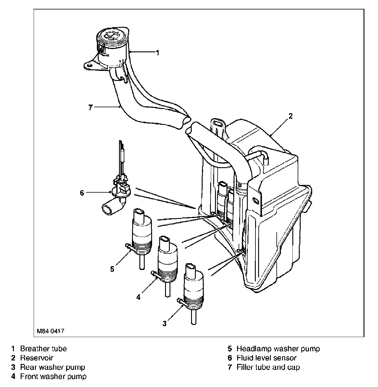The reservoir has three recessed holes on its rear face which provide location for the front, rear and headlamp washer pumps. The pumps are push fitted into grommets which seal the pumps in their locations. A hole in the top of the reservoir allows for the fitment of a flexible filler tube. The hose is routed into the left hand side of the engine compartment and is sealed with a rubber cap. A breather hose is fitted into an elbow on the top of the reservoir and is routed alongside the filler and secured in a clip near the filler cap in the engine compartment.