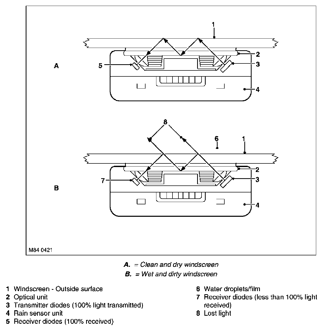 The rain sensor contains transmitter and receiver diodes which transmit and receive infrared light which is directed onto the windscreen via an optical unit. The light is directed at an angle so that the light is reflected 100% on the outside surface of the screen and is transmitted back into the optical unit. To receive a 100% reflection the outer screen surface must be clean and dry.