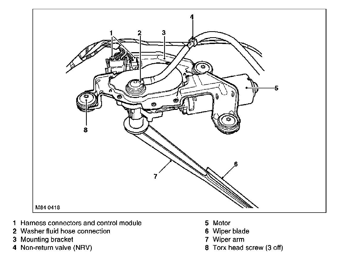 The rear wiper motor and control module assembly is located in the upper tail door behind a trim panel. The assembly is secured to a bracket on the upper tail door with three Torx head screws. Rubber bushes isolate the motor assembly from the bracket which help reduce the transmission of motor operating noise to the tail door.