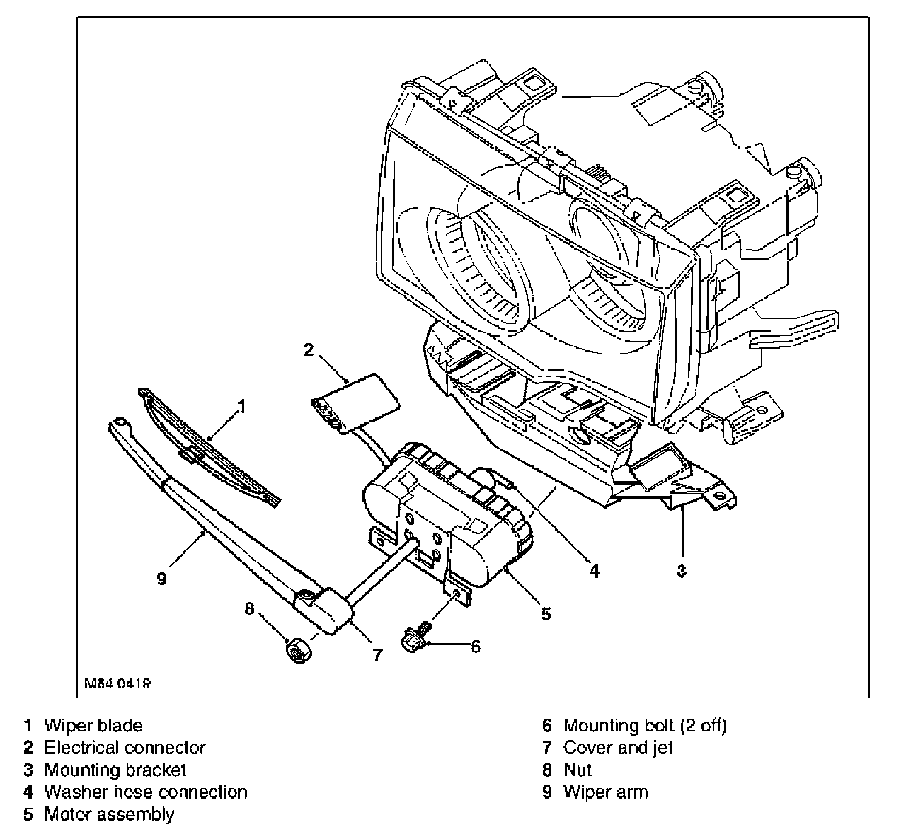 The headlamp wiper assembly is located below each headlamp. The assemblies are handed and therefore are not interchangeable. Each assembly is located on a bracket which is secured to the front panel and the headlamp. The motor is secured to the bracket with two bolts.