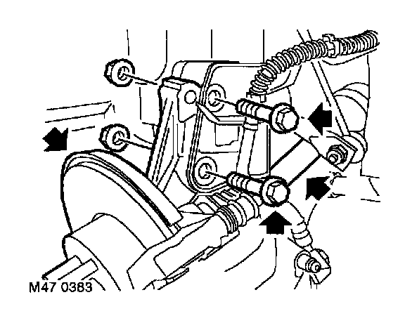 7. Remove 2 bolts securing brake caliper to hub. Release caliper from hub and tie aside.