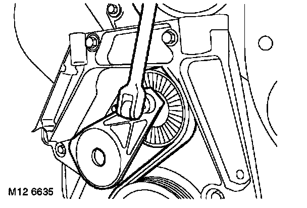 5. Ensure drive belt is located on ancillary pulleys, raise belt tensioner and fit drive belt to crankshaft pulley,