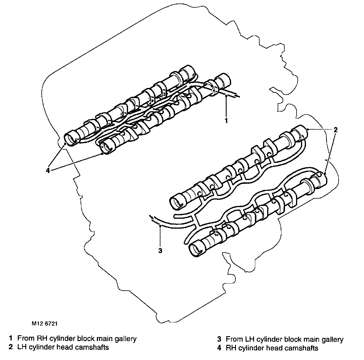 Oil at reduced pressure is directed to each cylinder bank via two restrictors in the cylinder block/cylinder head locating dowels, one at the front on the LH bank and the other at the rear on the RH bank. Oil then passes through a drilling in the cylinder head to the camshaft carrier, where it is directed via separate galleries to the camshaft bearings and hydraulic tappet housings. Return oil from the cylinder head drains into the sump via the cylinder head bolt passages.