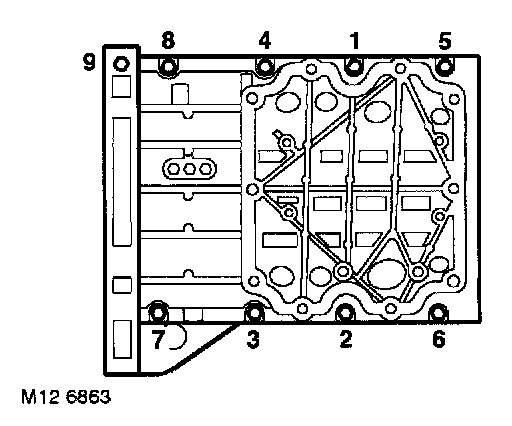 12. Fit new bolts and tighten in the sequence shown on the bearing ladder to 20 Nm (15 ft. lbs.), and then in sequence, tighten a further 90°.