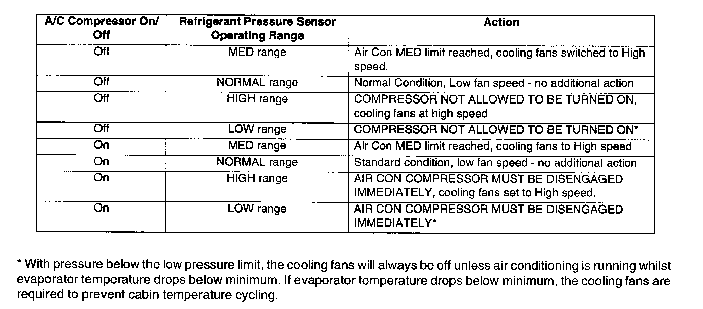 The Engine Control Module (ECM) controls the compressor and cooling fan operation in response to signals received from the refrigerant pressure sensor, evaporator temperature sensor and engine coolant temperature sensor, either directly or on the CAN Bus from the instrument pack. The refrigerant pressure can be low, medium or high, the system operating characteristics applicable for each condition is shown in the following table: