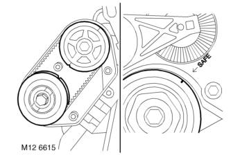 NOTE: Following front or rear timing belt refitment, it is possible that, after rotating the engine and positioning the crankshaft pulley to the 'SAFE' position, the timing marks on the rear timing gears may be misaligned. This misalignment is acceptable provided that the timing belt refitting procedure was carried out correctly.